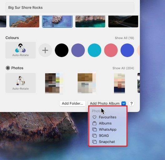 A continuación, también puede seleccionar una de las imágenes de esta lista. Si prefieres utilizar una de tus imágenes guardadas en tu Mac, haz clic enAgregar álbum de fotos. A continuación, seleccione su álbum preferido o seleccioneFotospara encontrar todas sus fotos guardadas en esta lista.