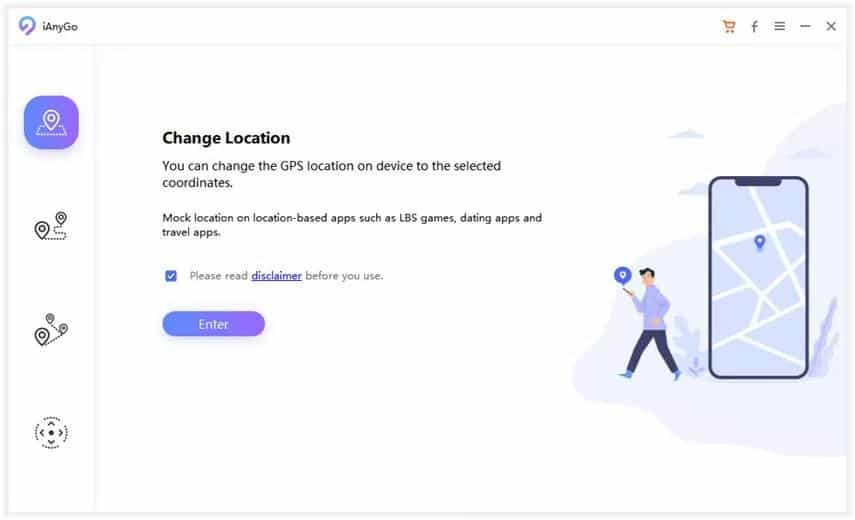 Paso 1:Seleccione la interfaz principal en el programa iAnyGo y cambie a Movimiento de un solo punto. Haga clic en el botón Entrar para continuar.