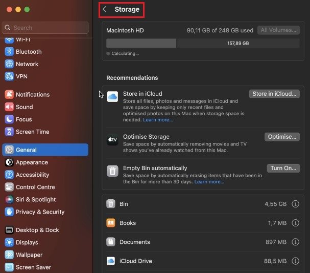 En elAlmacenamientosección, puede ver cuánto almacenamiento están ocupando sus aplicaciones, archivos, música y fotos instaladas. Para liberar rápidamente algo de almacenamiento, puede vaciar su papelera, eliminar archivos en su carpeta de descargas o deshacerse de las aplicaciones no utilizadas.