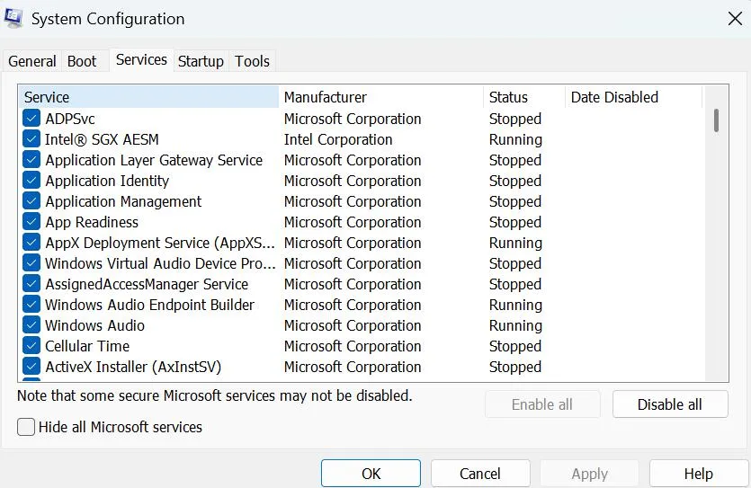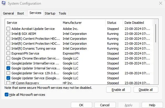 - Marque Ocultar todos los servicios de Microsoft y haga clic en Desactivar todo.
