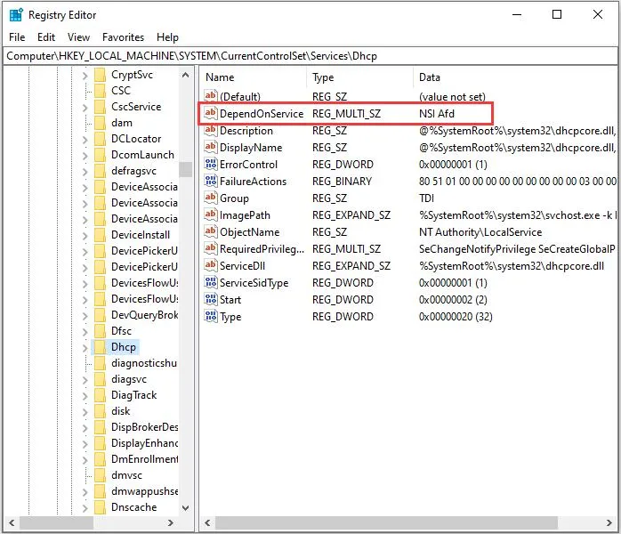 HKEY_LOCAL_MACHINE > SISTEMA > CurrentControlSet > Servicios > Dhcp