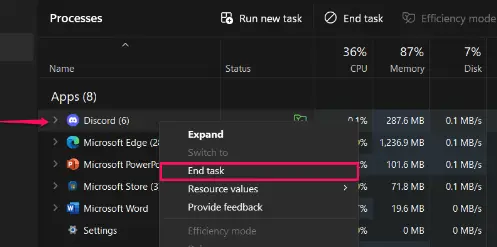 Paso 2: Ubique el proceso de Discord en la pestaña Procesos y haga clic derecho sobre él.