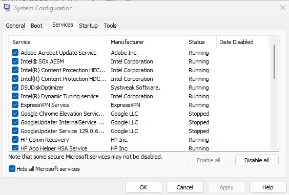 Paso 3: marque la casilla "Ocultar todos los servicios de Microsoft" para asegurarse de que estos servicios estén ocultos. Luego, haga clic en "Desactivar todo".