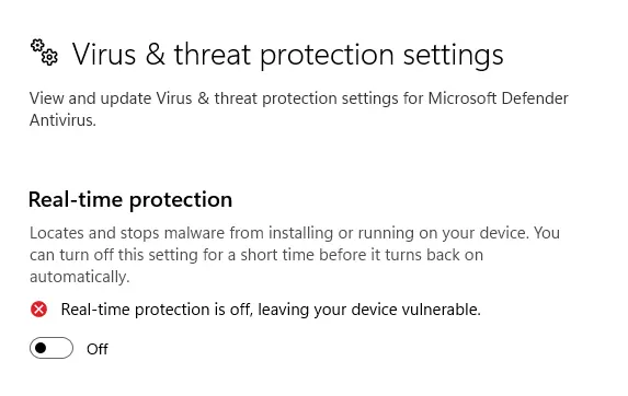 Paso 5: Deslice el botón de alternancia debajo de Protección en tiempo real hacia la izquierda para desactivarla.