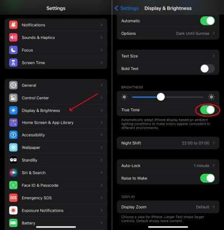 True Tone es otra función que también afecta el color y la intensidad de la pantalla de tu iPhone. Enesos modelos de iphoneCon True Tone Display, los sensores ajustarán automáticamente el color y la intensidad de la pantalla. En este caso, puedes desactivar True Tone para solucionar el problema de la pantalla verde.
