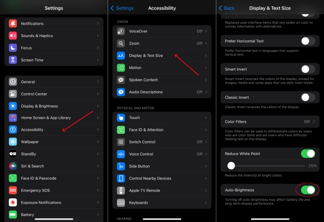 En Accesibilidad de pantalla, puede encontrar la función Brillo automático que está activada de forma predeterminada. Cuando el brillo automático está activado, el control deslizante de brillo de su dispositivo se mueve según las condiciones de luz cambiantes. Si notas que la pantalla de tu iPhone se vuelve verde, puedes desactivar el brillo automático.