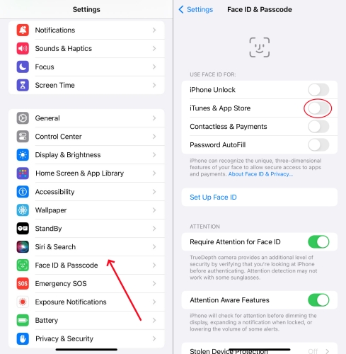 Deshabilitar Face ID o Touch ID para iTunes y App Store ha demostrado ser una forma de reparar el iPhone que solicita constantemente la contraseña de ID de Apple. Realice los siguientes pasos en su dispositivo.