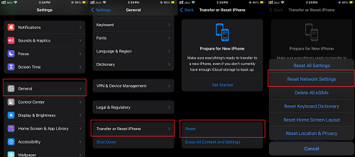 Vaya a Configuración > General > Restablecer > Restablecer configuración de red. Si se le solicita, ingrese su contraseña y confirme el restablecimiento.
