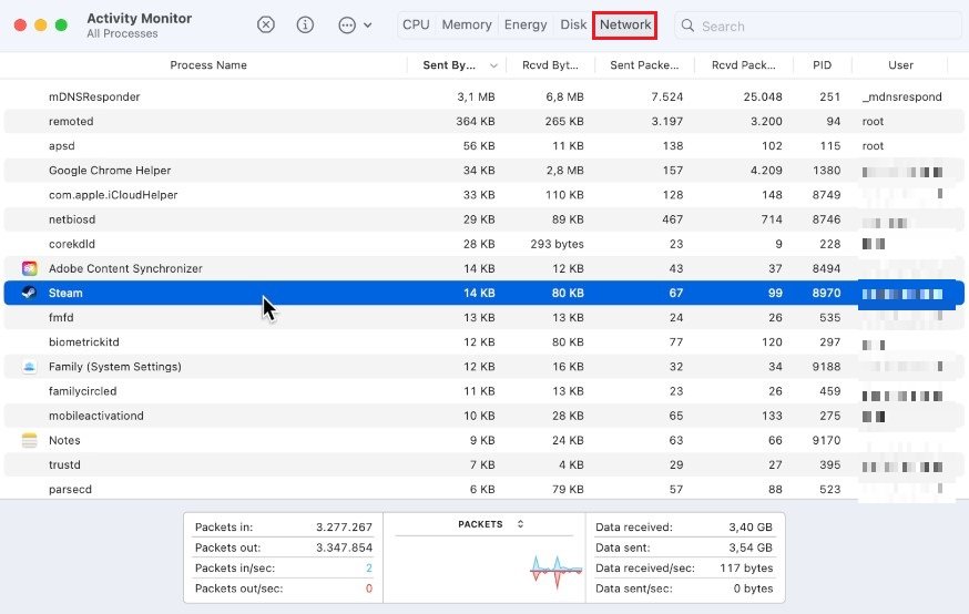 En esta ventana, navegue hasta elRedsección. Esto le permitirá obtener una vista previa y solucionar problemas de todos los procesos que utilizan su conexión de red en su Mac. En mi ejemplo, el navegador Chrome, Steam y los lanzadores de Epic Games o las actualizaciones de la aplicación Creative Cloud podrían bloquear mi conexión de red y provocar que las descargas se bloqueen.
