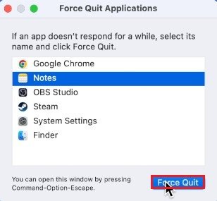 Asegúrese de cerrar estas aplicaciones por completo. Haga clic en el ícono de Apple en la parte superior izquierda de su pantalla y haga clic enForzar salida. Aparecerá una lista de aplicaciones en ejecución. Seleccione cada uno, haga clicForzar salida, o utilice el atajo Comando + Q.
