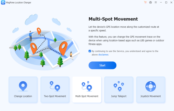 Descargue e instale MagFone Location Changer en su computadora, luego ejecútelo y conecte su dispositivo a la computadora mediante un cable USB. Seleccione el modo Multi-Spot en el software MagFone y haga clic en el botón Inicio.