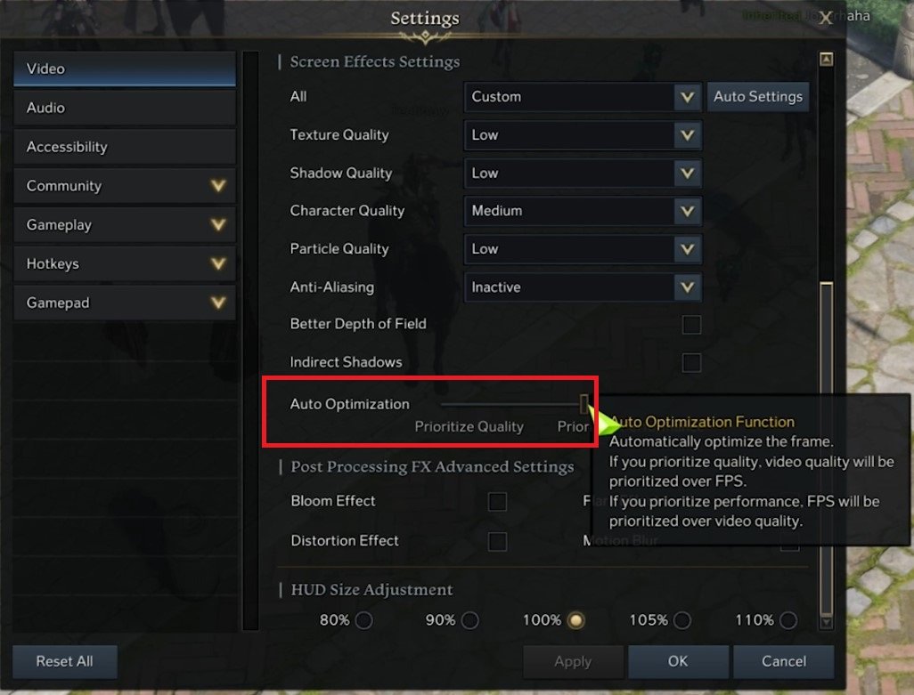 Inicie Lost Ark y navegue hasta su configuración. En elVideopestaña, mira tuOptimización automáticaopción, que priorizará laVideoajustes aCalidadoActuación. Cuando experimente caídas de FPS, asegúrese de configurar este control deslizante enActuación. Esto cambiará la configuración de video mientras estás en el juego sin tener que revisarla cuando experimentes problemas de bajo rendimiento o velocidad de fotogramas.