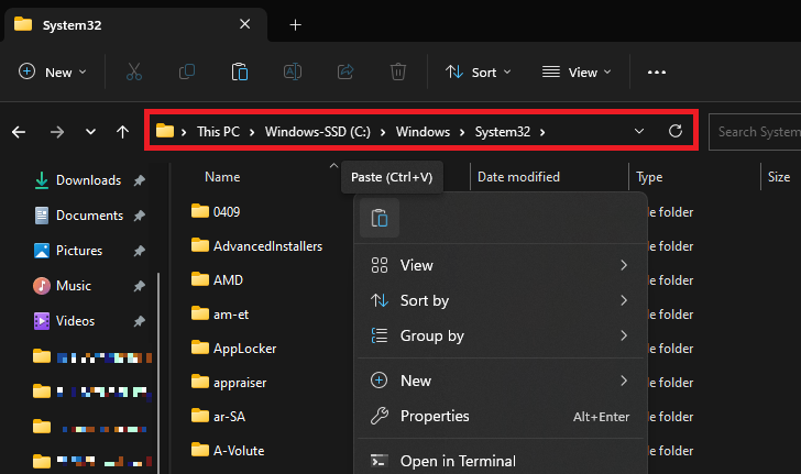 Aquí, sigue la ruta: Windows > System32. En este directorio, pegue el archivo DLL previamente copiado.