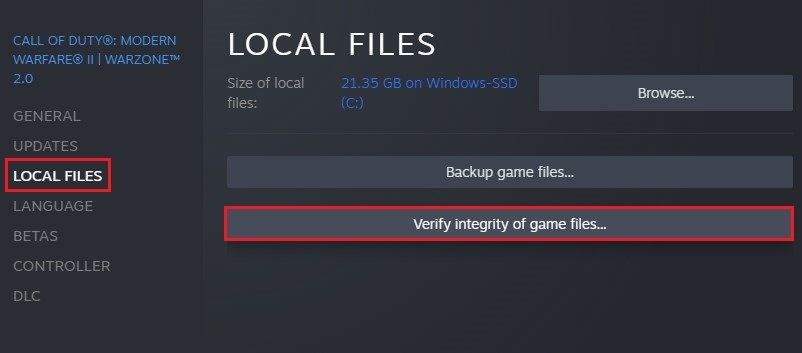 Navega hasta elArchivos localessección y haga clic enVerificar la integridad de los archivos del juego.. Esto tomará un minuto para volver a descargar y reemplazar cualquier archivo dañado o faltante de Warzone 2.