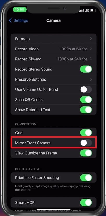 BajoComposición, puede habilitar o deshabilitar la opción Espejo de cámara frontal en la configuración de su cámara. Cuando esté habilitado, girará la cámara frontal para todas las aplicaciones y la aplicación de cámara incorporada.