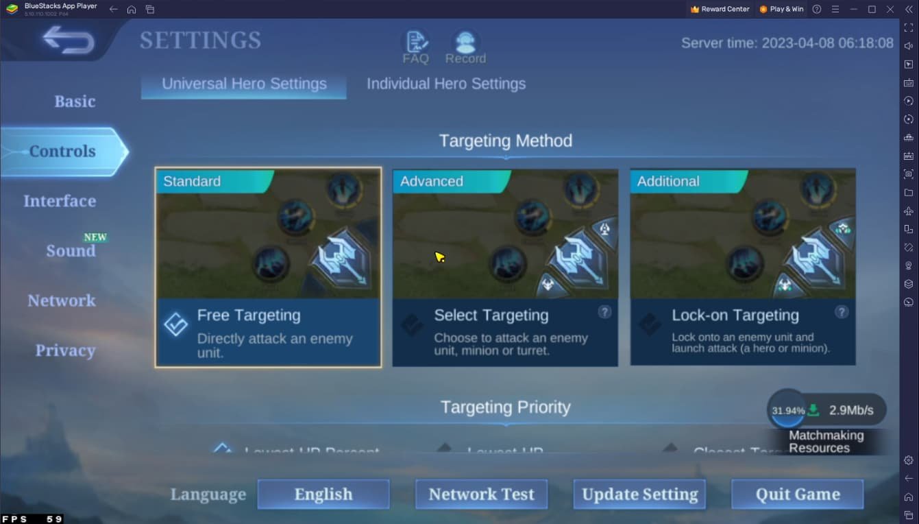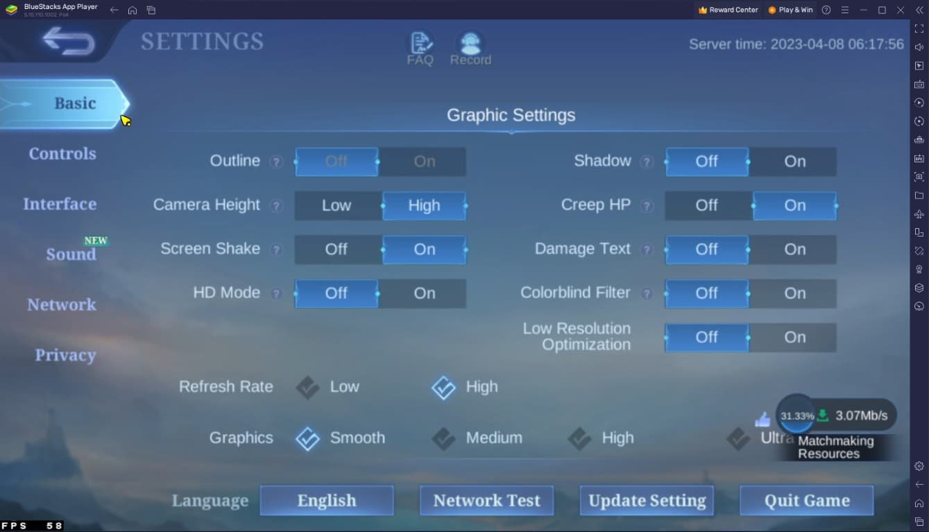 Una vez que hayas iniciado el juego, navega hasta la configuración del juego para optimizar tu experiencia de juego. Si enfrenta retrasos o problemas de rendimiento mientras juega Mobile Legends en su PC, considere reducir el ajuste preestablecido de gráficos y la frecuencia de actualización en la sección Básica.