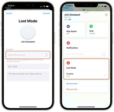 Los AirTags se pueden rastrear usando la pestaña Elementos en Buscar mi y, al igual que sus dispositivos Apple, si uno se pierde, puede ponerlo en Modo perdido para localizarlo. Si hay un AirTag cerca, se conectará a un dispositivo Apple a través de Bluetooth para transmitir su ubicación, e incluso hay una función de búsqueda de precisión en el iPhone 11 y 12 que utiliza el chip U1 para encontrar elementos extraviados cerca.