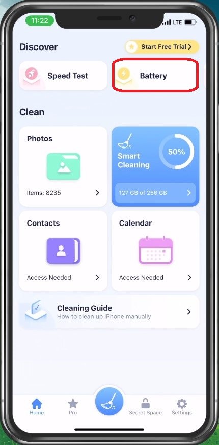 Abra Smart Cleaner y toqueBateríaen la parte superior derecha de tu pantalla.