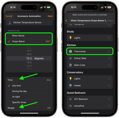 - GrifoPróximo, luego asigne un nombre a su automatización en la parte superior del menú y configure su accesorio para realizar una acción. Aquí, configuramos el termostato para calentar la cocina a 71,6 grados Fahrenheit o 22 grados Celsius.