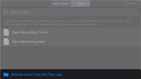 Paso 4. Toque el botón Bucle, luego vaya a Archivos y finalmente elija Buscar elementos en la aplicación Archivos.