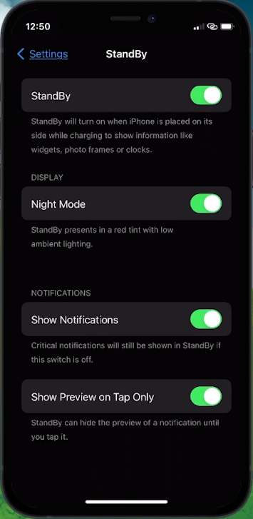 Comience lanzando elSettingsaplicación en tu iPhone. Desplázate por las opciones hasta que te topes con elStandBycaracterística. Al seleccionarlo, mueva el interruptor a la posición ON para activar el modo StandBy. Esta acción revela configuraciones de personalización adicionales, lo que le permite adaptar el modo a sus preferencias.