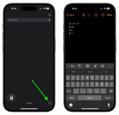 No está limitado a acceder a Math Notes a través de la aplicación Calculadora; también puede usar la función directamente dentro de la aplicación Notes usando cualquier nota nueva o existente.