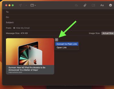 Por el contrario, macOS Ventura inserta vistas previas de enlaces enriquecidos en los correos electrónicos. Las vistas previas de enlaces convierten la dirección web en una instantánea visual del contenido vinculado, de modo que los destinatarios puedan ver lo que hay al otro lado del enlace antes de hacer clic en él.