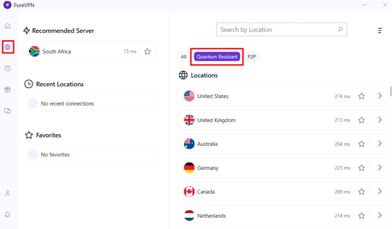 Estos servidores pueden diferir entre aplicaciones, pero según el servicio de atención al cliente,todos los usuarios encontrarán servidores PureVPN Quantum-Resistant en estas ubicaciones:
