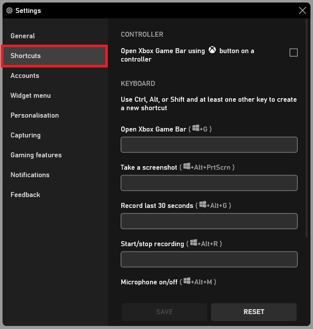 Revisaremos la configuración de tu barra de juegos para optimizar tu grabación y accesos directos según tus preferencias. Haga clic en el ícono de ajustes en la parte superior derecha de su pantalla. En elAtajos, configure estos accesos directos según sus preferencias, pero asegúrese de utilizar un acceso directo que no esté asignado actualmente en su PC.