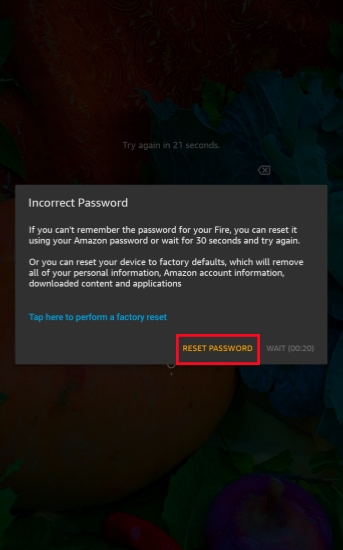 También puede restablecer los valores de fábrica de su tableta Amazon Fire mediante el restablecimiento del PIN en la interfaz bloqueada. Pero debes recordar tu cuenta y contraseña de Amazon. Para restablecer su PIN desde la pantalla de bloqueo, siga estos pasos.