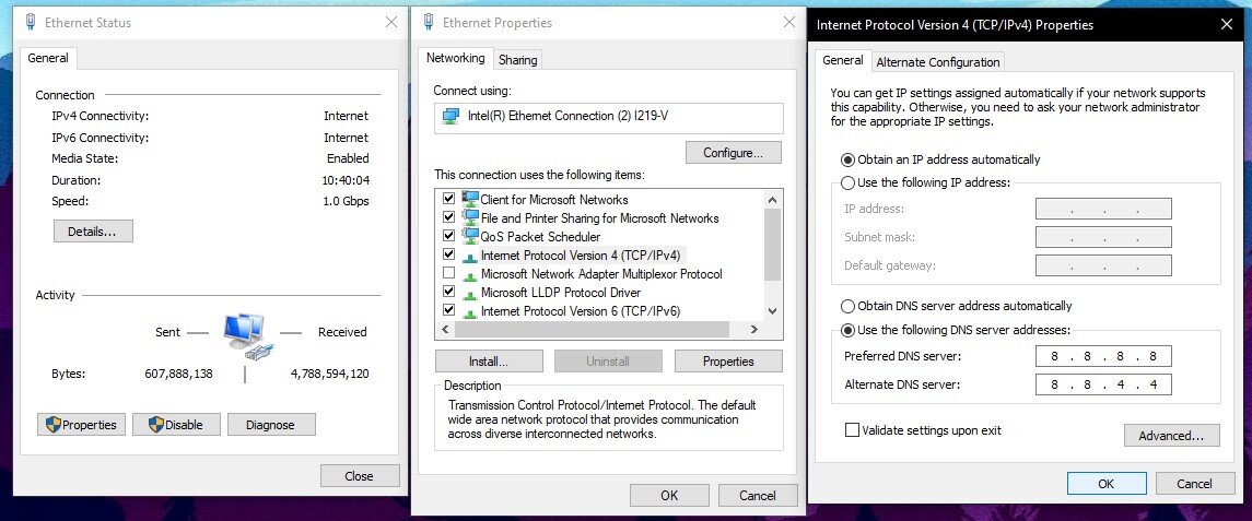 Esto abrirá su centro de control. Desde allí, navegue hasta “Redes e Internet > Centro de redes y recursos compartidos” y seleccione su conexión. Navegar aPropiedadesy haga doble clic enProtocolo de Internet versión 4,como puede obtener una vista previa en la captura de pantalla a continuación. Seleccione paraUtilice las siguientes direcciones de servidor DNSopción, y como su servidor DNS preferido, use:8.8.8.8y como servidor DNS alternativo, utilice:8.8.4.4.Estas son las direcciones del servidor DNS público oficial de Google, que son seguras de usar.