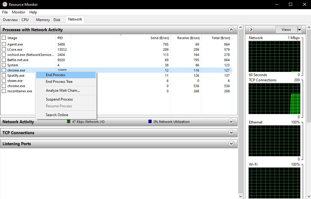 Es fundamental tener precaución al finalizar los procesos; Solo finalice aquellos que esté seguro de que no afectarán negativamente a su sistema operativo. Familiarícese con los procesos en cuestión para evitar causar inestabilidad en el sistema sin darse cuenta. Además, observe la pestaña "Utilización de la red" ubicada debajo de la lista de procesos, que muestra el uso de su red en forma porcentual. Esta métrica puede proporcionar un contexto valioso para comprender la demanda general de su red.