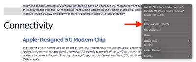 A fines del año pasado, Apple se unió al club y brindó soporte completo a Safari 18.2. Para utilizar la función, visite una página web y simplemente resalte el texto al que desea crear un enlace, luego haga clic derecho y elijaCopiar enlace con resaltadoen el menú desplegable.