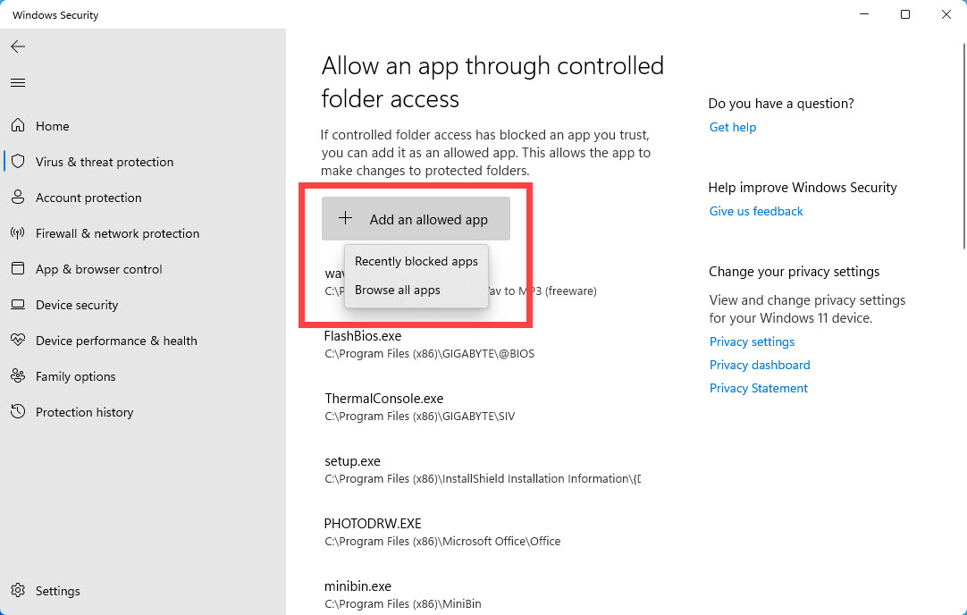 Ya he mencionado que algunos programas, especialmente juegos, pueden ser bloqueados por la protección ransomware. Al hacer clic en el enlace Permitir una aplicación a través del acceso controlado a la carpeta, podrá agregar aplicaciones y juegos a la lista de exclusión de la misma manera que agrega carpetas a la protección. Hay opciones para explorar todas las aplicaciones o agregar una aplicación bloqueada recientemente.