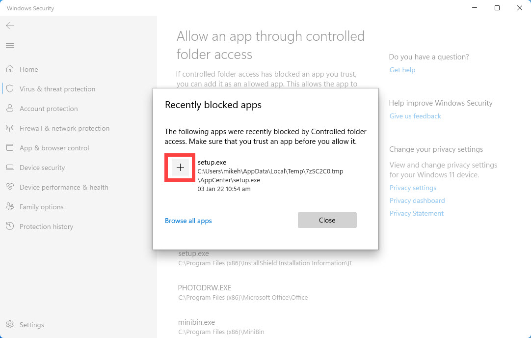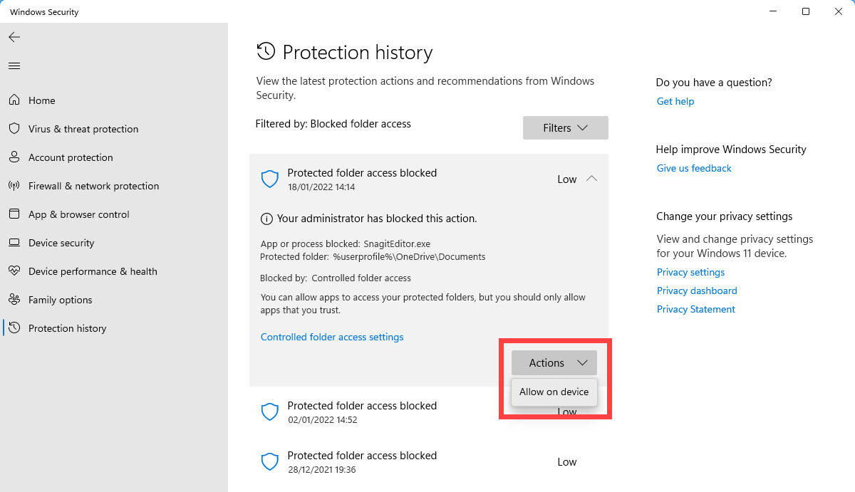 Si ve un mensaje emergente en su pantalla que dice que una aplicación ha sido bloqueada mediante acceso controlado a carpetas, aún puede agregarla, ya sea de la manera que acabo de describir o, en la página de protección contra ransomware, haciendo clic en el enlace Bloquear historial. Esto presenta una lista de todos los programas que han sido bloqueados, ordenados por fecha y hora para que sea más fácil encontrar el que estás buscando.