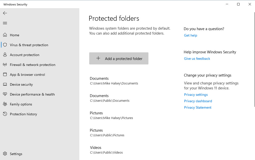 De forma predeterminada, la protección contra ransomware protegerá todas sus carpetas de documentos, Documentos, Imágenes, Música y Vídeo, pero puede agregar otras carpetas si es necesario, tal vez porque ha movido sus archivos y documentos a una unidad de su PC diferente a aquella en la que está instalado Windows.