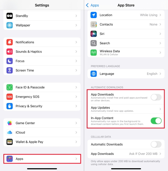 Paso 2.En Descargas automáticas, desactiveDescargas de aplicaciones.