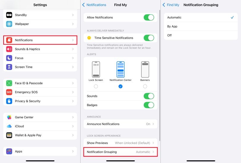 Paso 2.GrifoAgrupación de notificacionesy cambiar de Automático aApagadooPor aplicación.