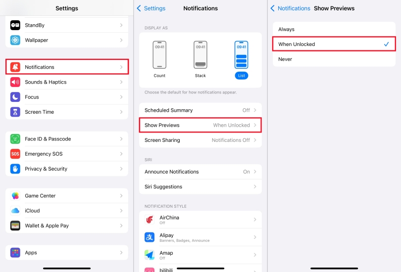 Paso 2.GrifoMostrar vistas previasy configúrelo enCuando está desbloqueado.