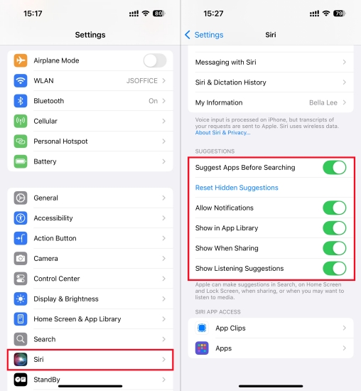 Paso 3.Desplácese hacia abajo para administrar las sugerencias de Siri por aplicación.
