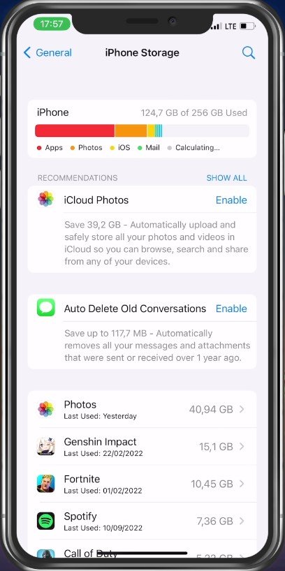 Si su conexión de red parece estar bien, diríjase a su aplicación de configuración. Aquí, en General, toqueAlmacenamiento de iPhone. Es posible que tarde un par de segundos en cargar la información de almacenamiento y, una vez hecho esto, podrá obtener una vista previa si le queda suficiente almacenamiento disponible. Sugeriría tener al menos 4 GB para descargar la última actualización de iOS. Puede seguir las recomendaciones de almacenamiento, como eliminar películas vistas o aplicaciones no deseadas de su dispositivo.