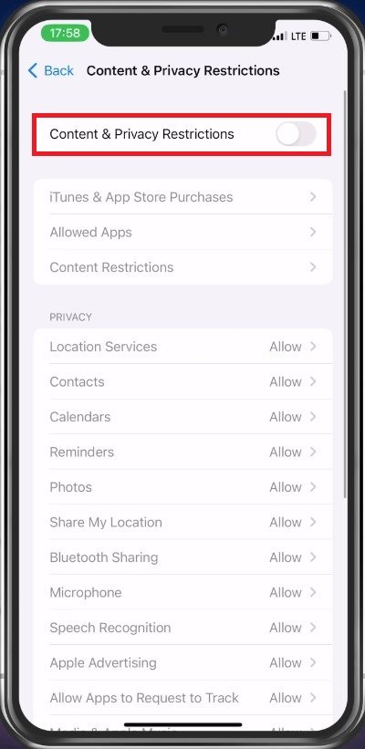 Por último, regrese a su configuración principal y toqueTiempo de pantalla. Aquí, bajoRestricciones de contenido y privacidad, asegúrese de desactivar todas las restricciones antes de actualizar su iPhone o iPad.