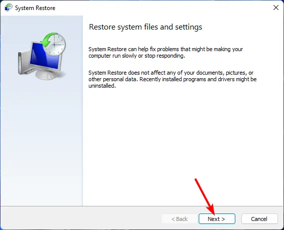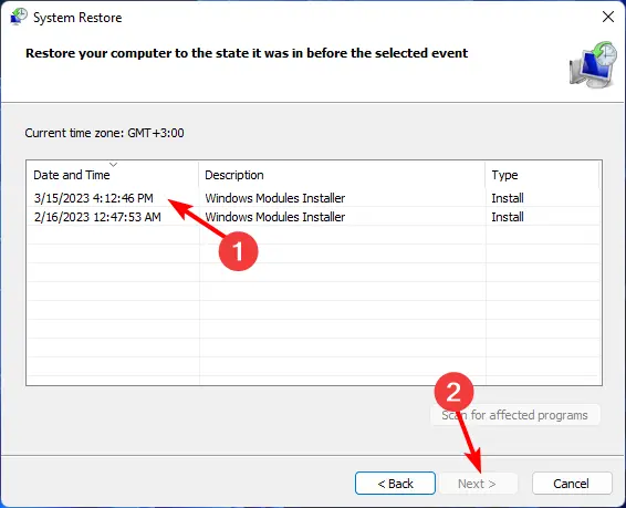 Paso 4: elija el punto de restauración y haga clic en Siguiente.