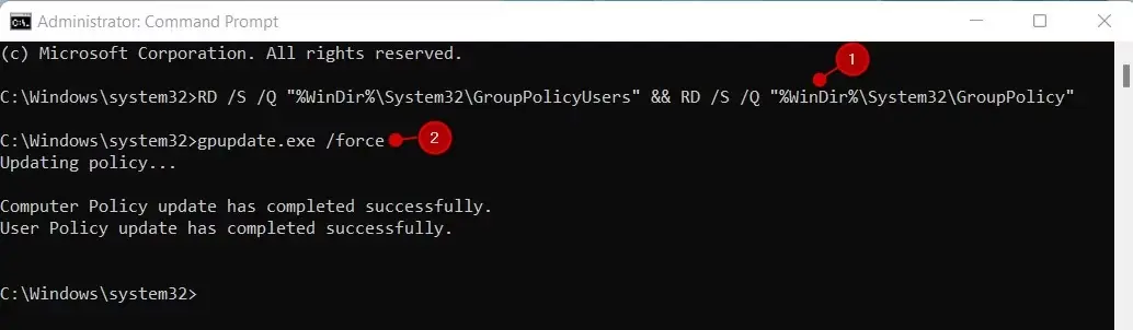 RD /S /Q “%WinDir%System32GroupPolicyUsers” && RD /S /Q “%WinDir%System32GroupPolicy”