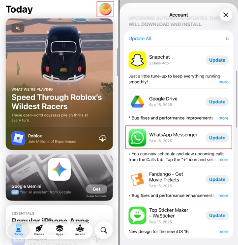 Paso 2.Desplázate para comprobar si WhatsApp está en la lista de actualizaciones. Toque Actualizar si está disponible.