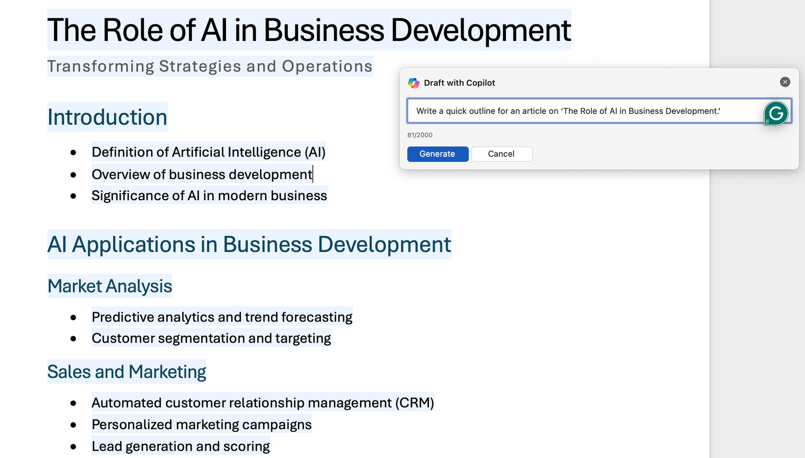 Por ejemplo, quería escribir sobre "El papel de la IA en el desarrollo empresarial". Entonces, le pedí a Copilot: "Escribe un resumen rápido para un artículo sobre el papel de la IA en el desarrollo empresarial". Luego, el asistente de IA generó el siguiente esquema para mí.