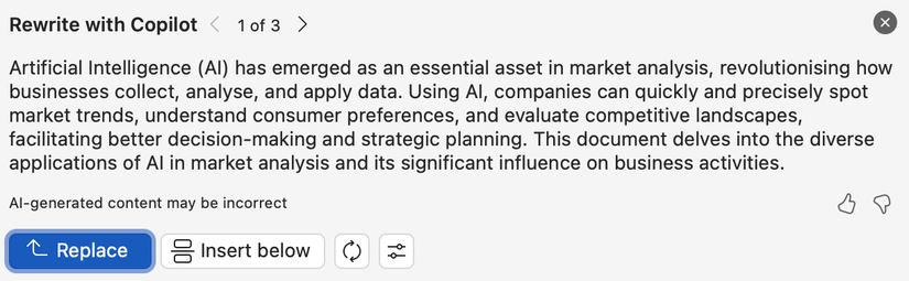 A veces termino de escribir un documento pero quiero revisar algunos párrafos. En estos casos utilizo, que me ofrece tres versiones alternativas del texto para elegir. Para usar esta función, simplemente selecciono el texto, hago clic en el ícono Copilot y selecciono "Reescritura automática". Si me gusta alguna opción, hago clic en el botón "Reemplazar".