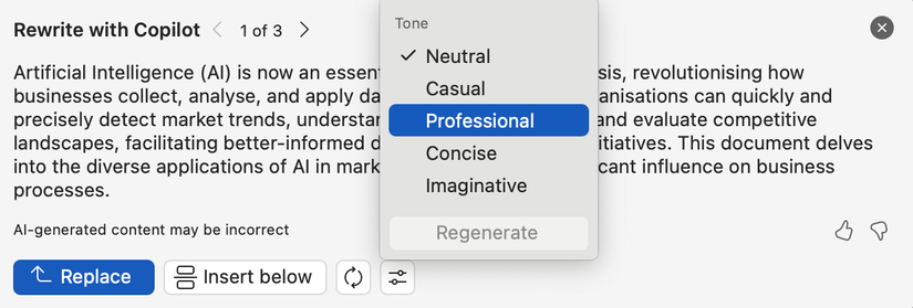Copilot también me permite adaptar el tono del texto para que coincida con el público objetivo de mi documento. Esto garantiza que el contenido mantenga el tono deseado en todo momento y elimina la necesidad de reescribirlo para diferentes audiencias. Copilot ofrece cinco opciones de tonos: Neutral, Profesional, Informal, Imaginativo y Conciso.