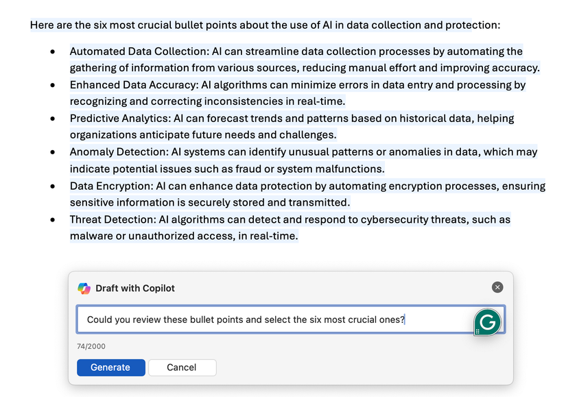 A veces, accidentalmente excedo el número de palabras y necesito eliminar los puntos menos útiles y conservar los importantes. De manera similar, a menudo termino con demasiadas viñetas cuando solo puedo usar la mitad. En estos casos, confío en Copilot para que me ayude a decidir qué conservar y qué eliminar, básicamente tomando la decisión por mí.