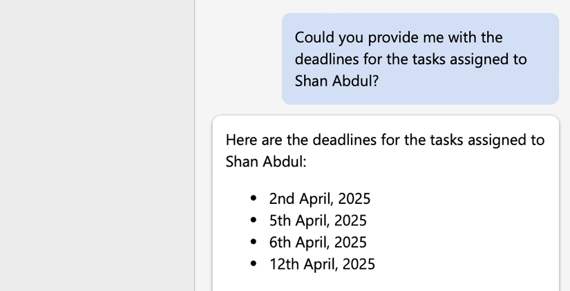 También puedo extraer información relevante de un documento haciendo preguntas específicas. Esta es una de mis funciones favoritas del asistente de IA. Puedo hacer preguntas de seguimiento para cada respuesta para refinar aún más las respuestas. Por ejemplo, si mi colega me envía un plan de proyecto, puedo pedirle a Copilot que ubique las tareas que me asignaron.